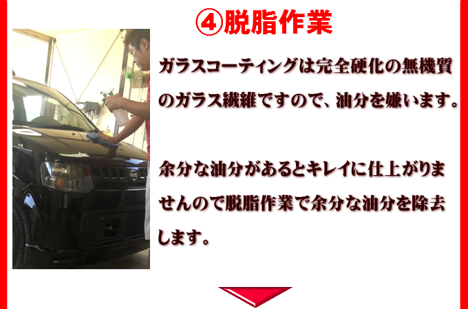塗装面の状態が著しく劣化している場合(例えばチョーキング現象※1が発生しているなど)施工を避けた方が良い場合もありますが、きちんと下地処理すればキレイになりますせっかくのお気に入りの車や二回目またガラスコーティングしたいけど高いと あきらめている方など、一人でもお助けできれば、喜んでいただければと思っております。
