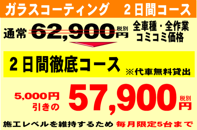 これは現在のコーティングにおいて、最もグレードが高いコーティング手段で傷も付きにくく、一度ガラスコーティングすれば、1年以上効果が持続するため安心して車を使用することができます。