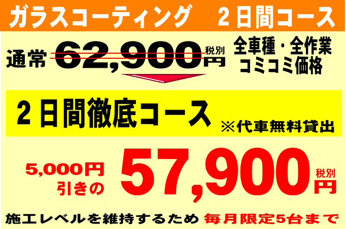 はい。すべて含んでの価格です。当店は、ずっとキレイに愛車を乗っていただきたい思いでおります。ガラスコーティング は下地処理がとても重要です(濃色の車は洗車キズやウォータースポットが目立ちますので特に細心の注意が必要です)ので、キレイに仕上がる準備が整うまで、下地処理に時間を掛けております。そのすべての工程が含んでの価格ですので、車種を問わずご用命ください。