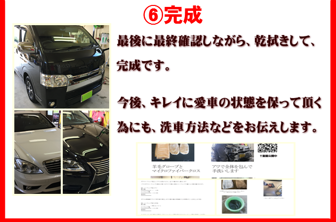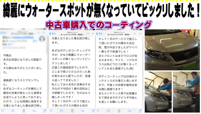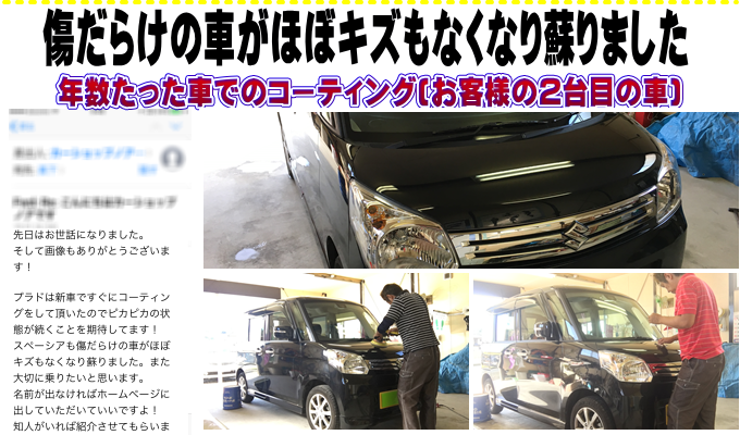 当店では、その車に適正下地処理で(みがき作業)でピカピカにしてからのガラスコーティング剤を塗って仕上げますので、仕上りと耐久性が違います。