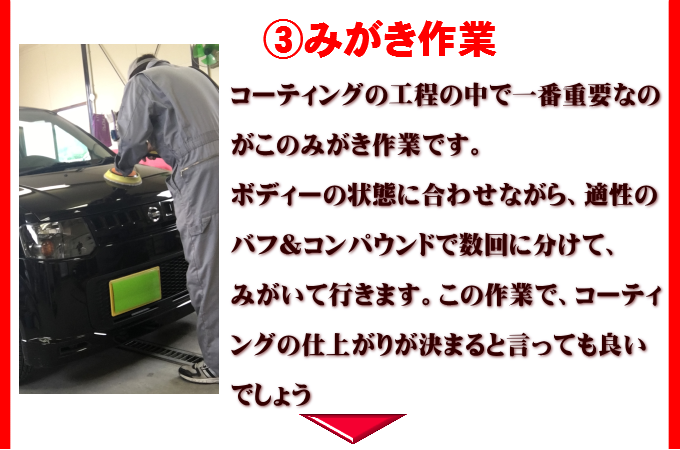 当店では、コーティング剤を塗るだけで仕上げるのではなく、車の状態に最適な下地処理(みがき作業)をして、ピカピカにしてからコーティング剤を塗って仕上げます。